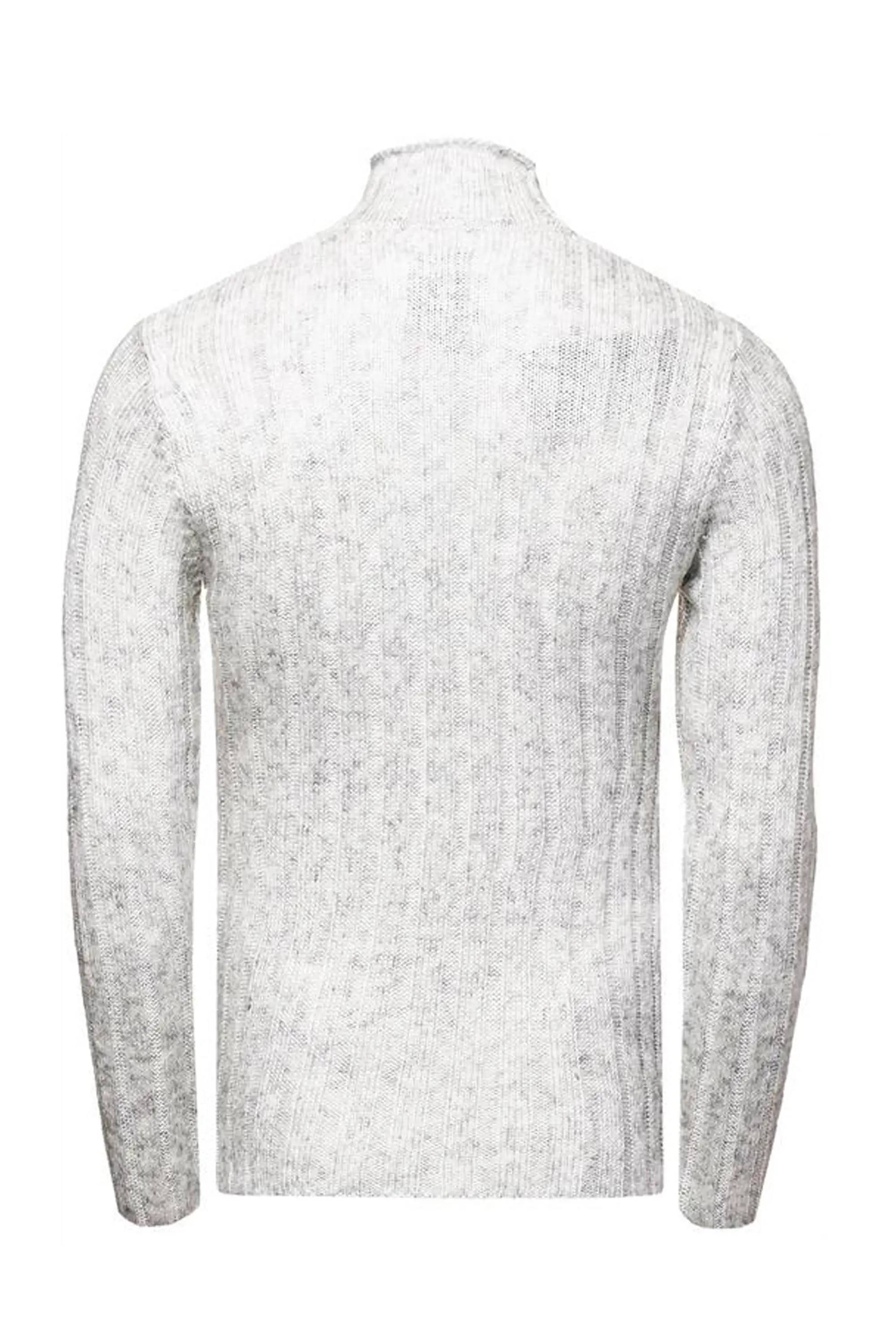Miesten vaaleanharmaa neulepaita brändiltä RUSTY NEAL. Pystykaulus, trendikäs kuviointi pinnassa ja logo helmassa.