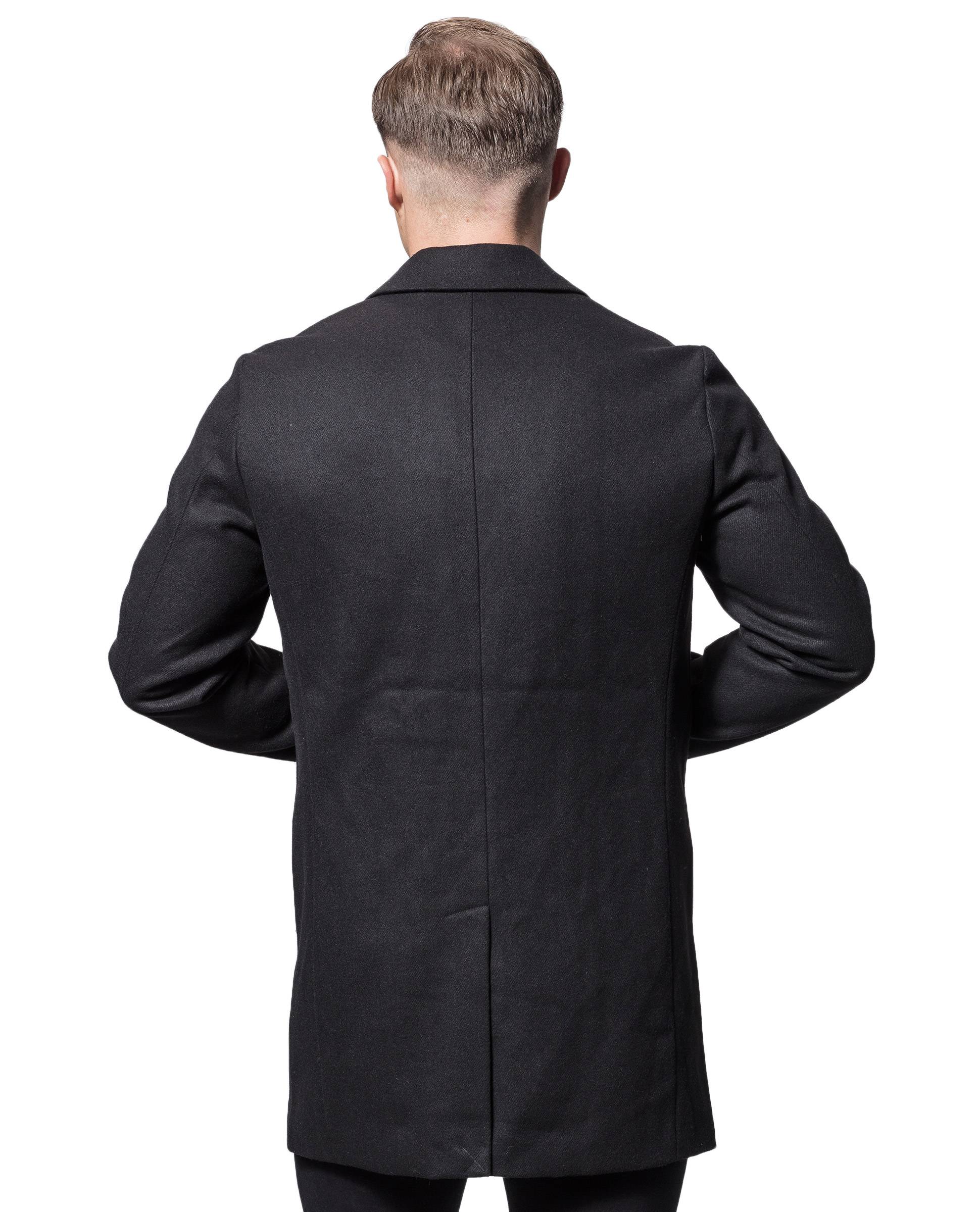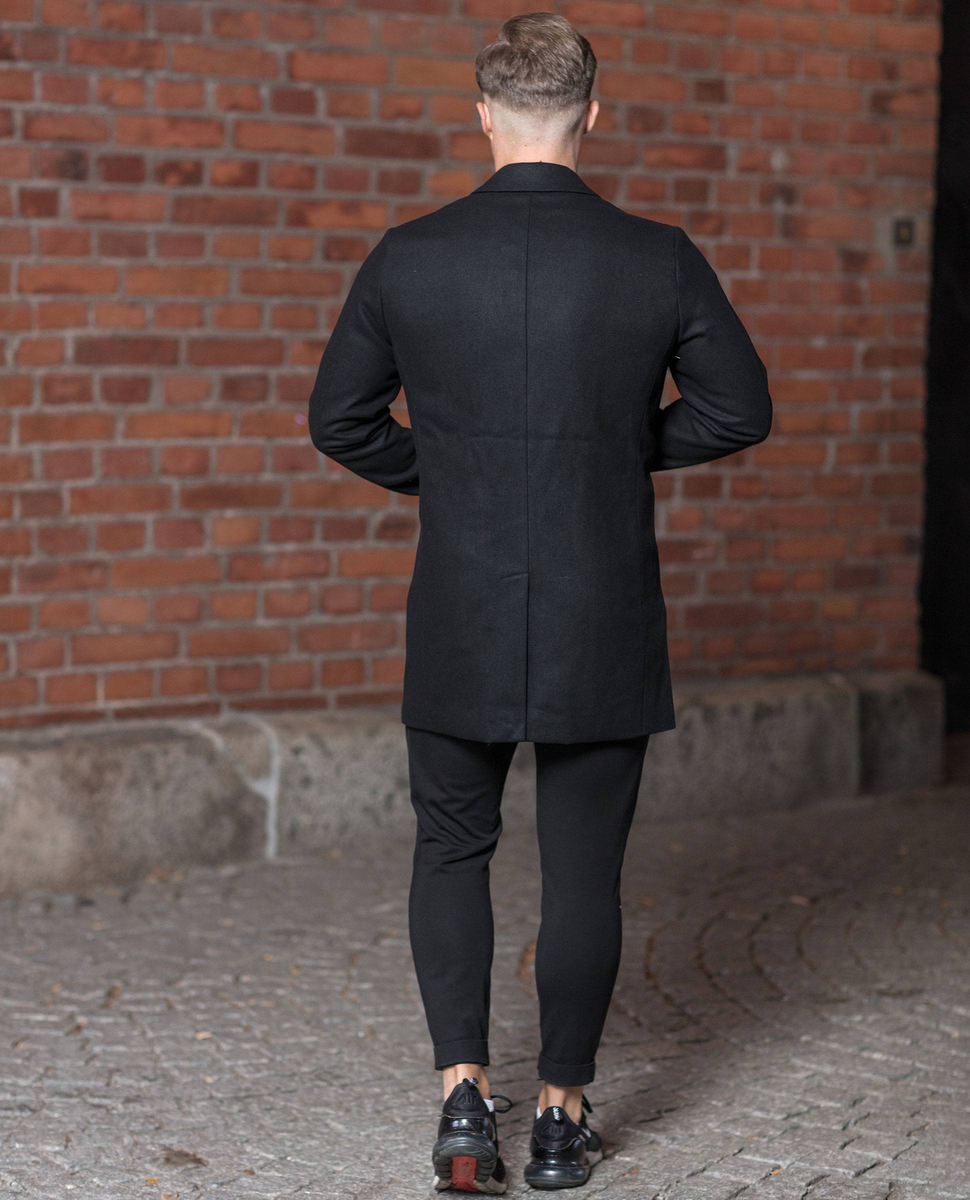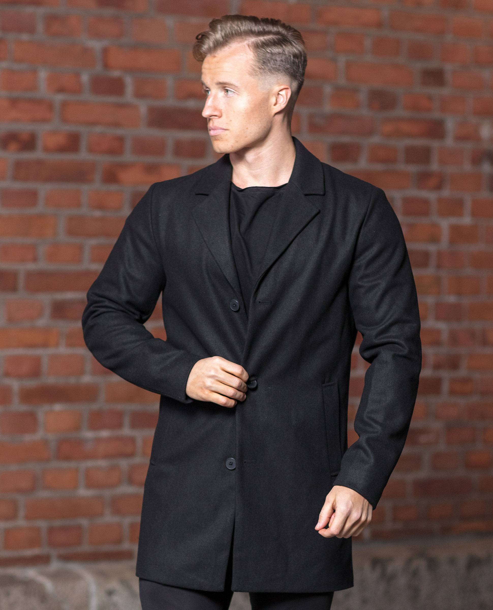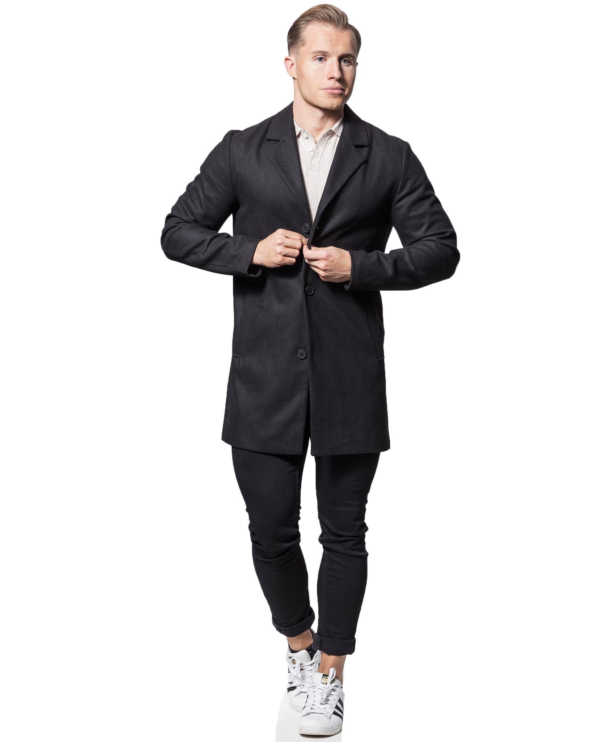 JACK & JONES musta villakangastakki. Klassinen malli, jossa mustat napit etupuolella, kahdet etutaskut sekä klassinen kaulus. Povitasku. Hieman ohuempi kangas, joten sopii hyvin syksyyn tai kevääseen. Lämpöasteikko 2,5/5.