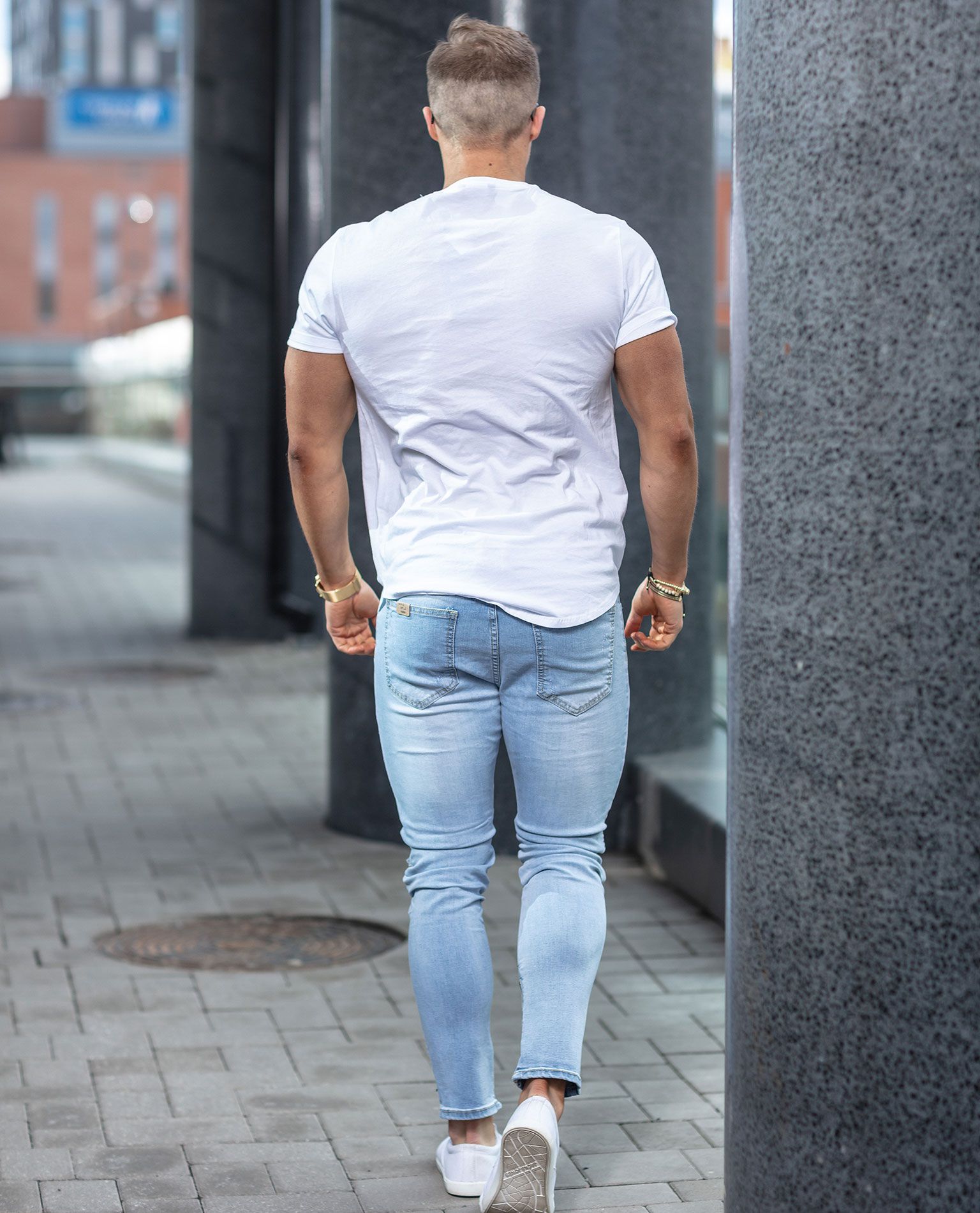 Miesten valkoinen t-paita brändiltä ONLY&SONS. Hieman pidempi malli, jossa pyöristetty helma. Logo helmassa.