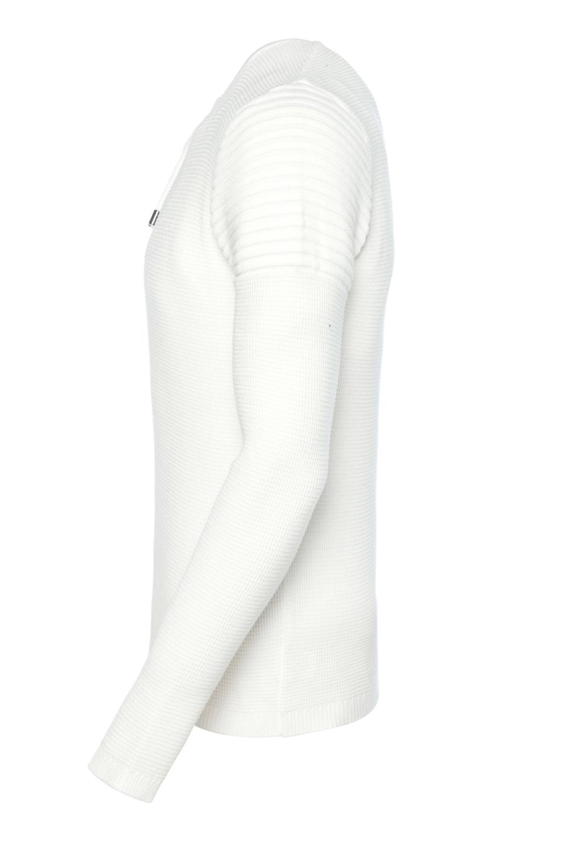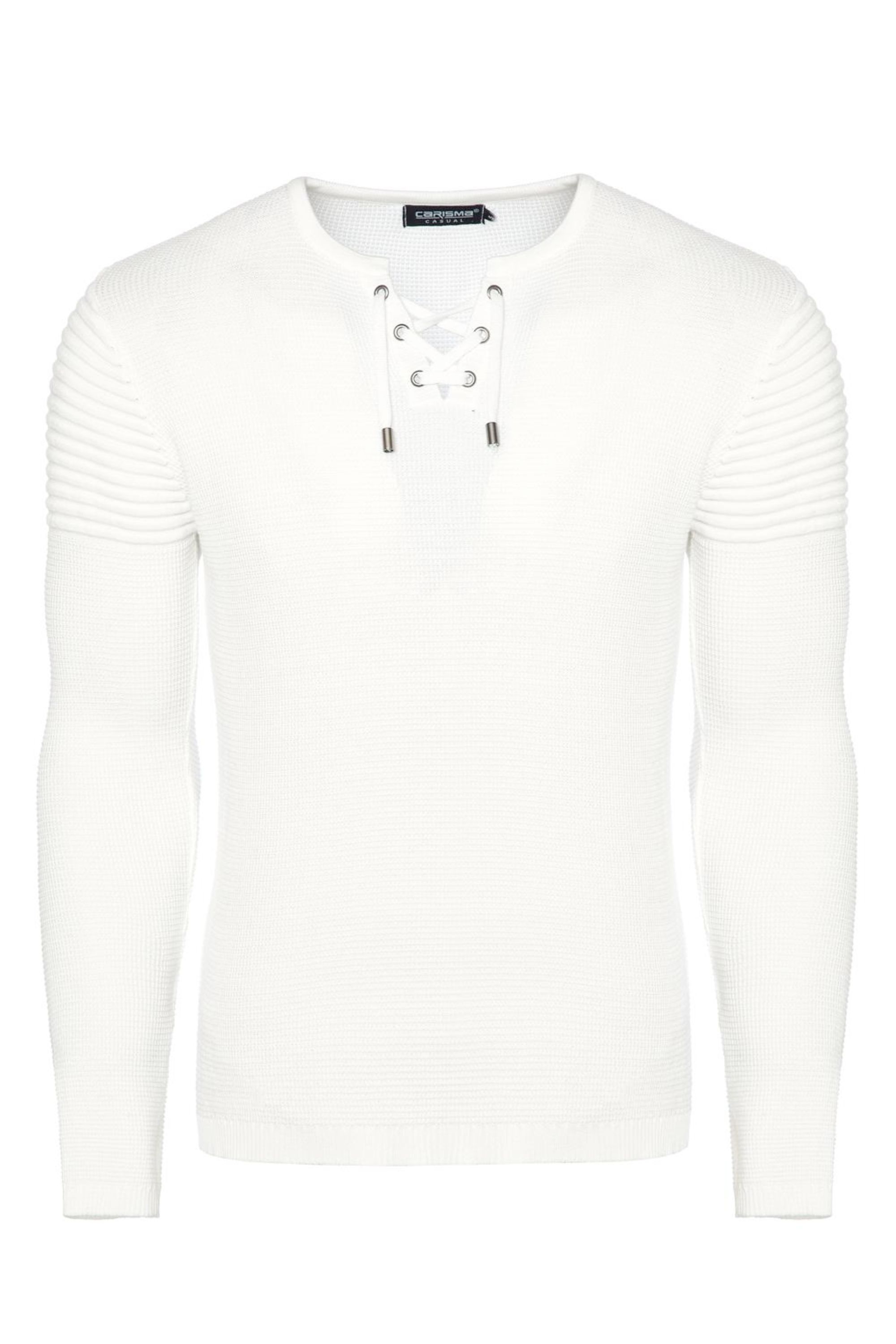 Miesten valkoinen neule kevyestä ja joustavasta neuloksesta brändiltä CARISMA. Nyörit kaula-aukossa, ribbikoristelut hihoissa.Jos mietit kahden koon välillä, ota isompi.