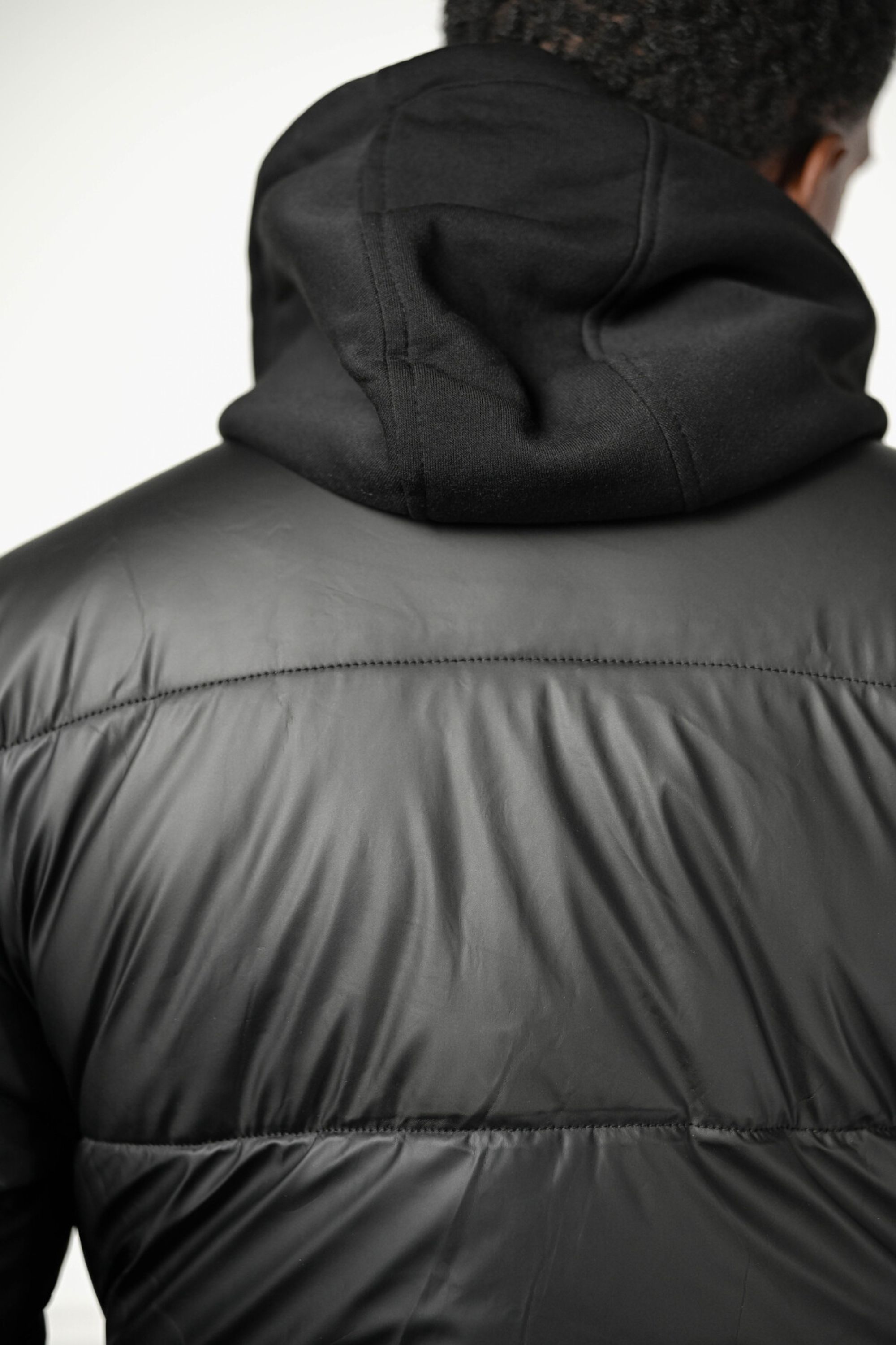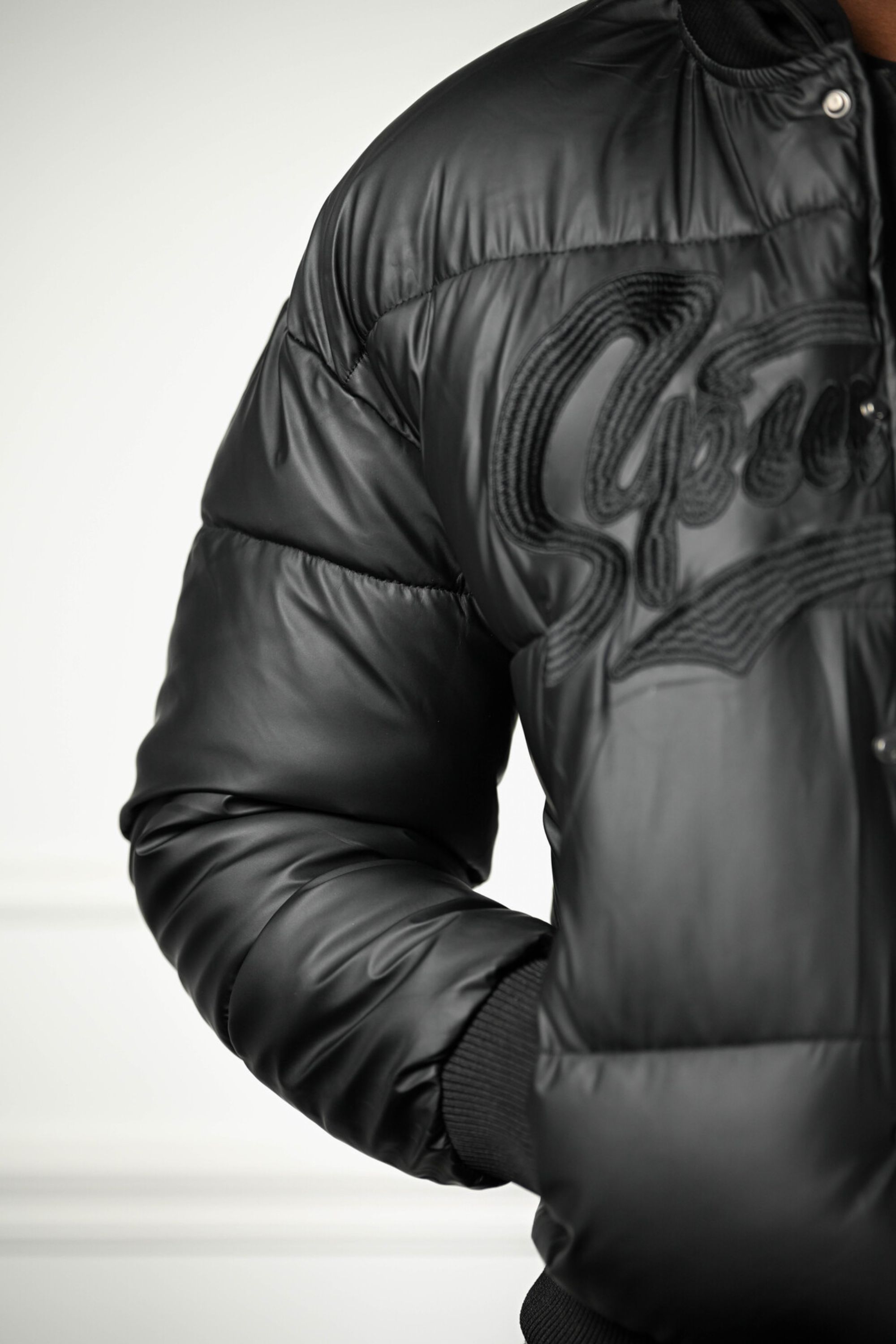 Miesten trendikäs musta puffer-takki. Takin pinta on liukaspintaista, mutta keinonahkan näköinen, hieman mattamainen.Resorit helmassa ja hihansuissa. Edessä vetoketju ja nappikiinnitys. Rinnassa näyttävä, kohokuvioitu kirjailu. Kaksi etutaskua. Irrotettava musta collegehuppu. Vetoketjullinen povitasku puhelimelle ja muille arvoesineille. Tällä pärjää helposti pelkällä t-paidalla tai ohuella hupparilla alla. Lämpöasteikko 4/5.
