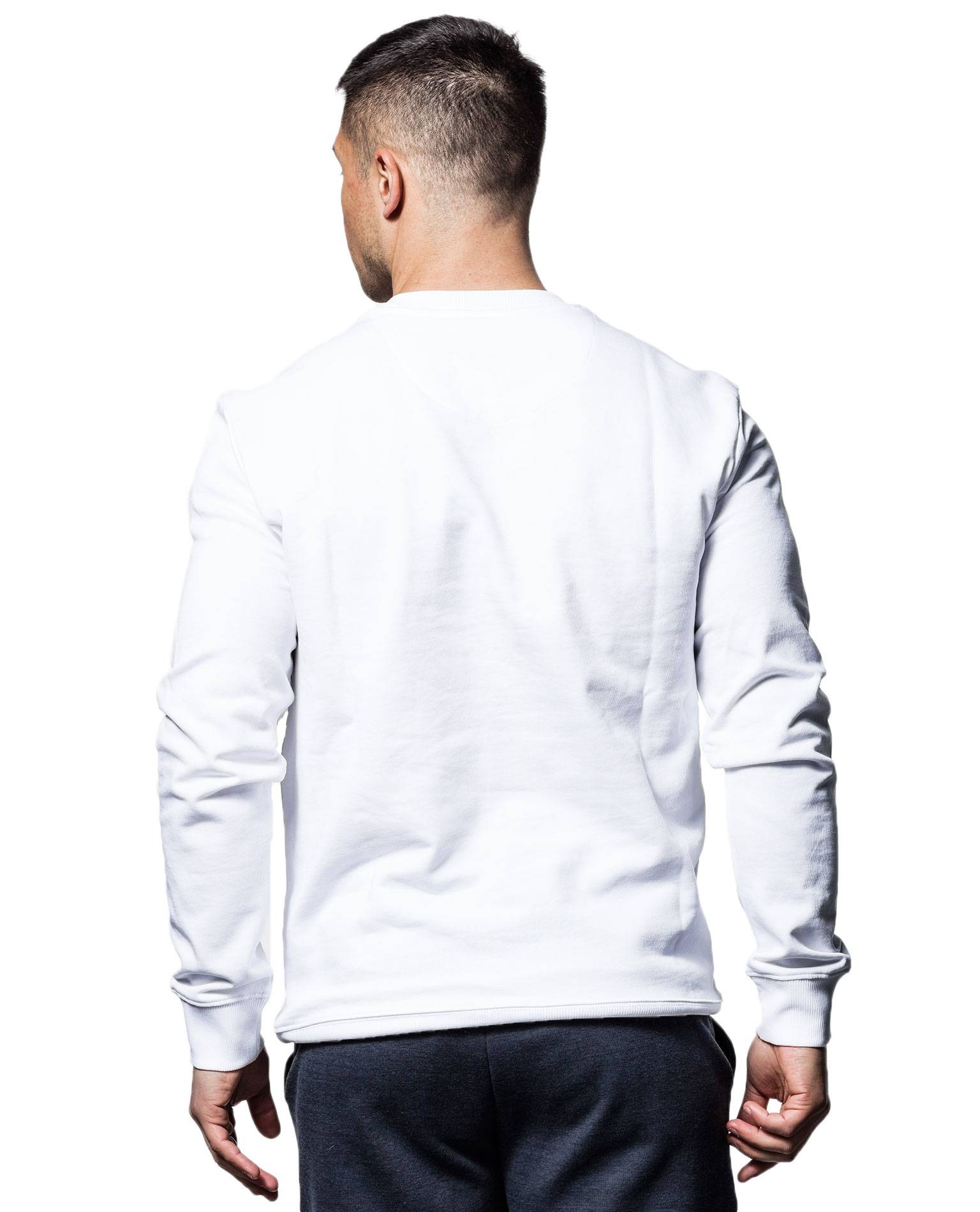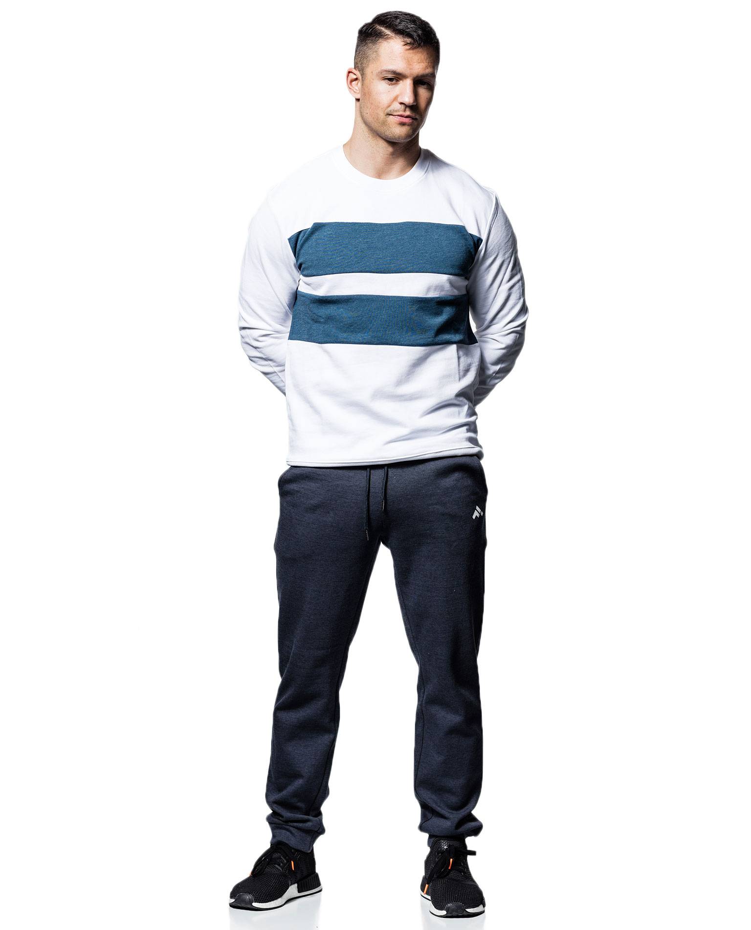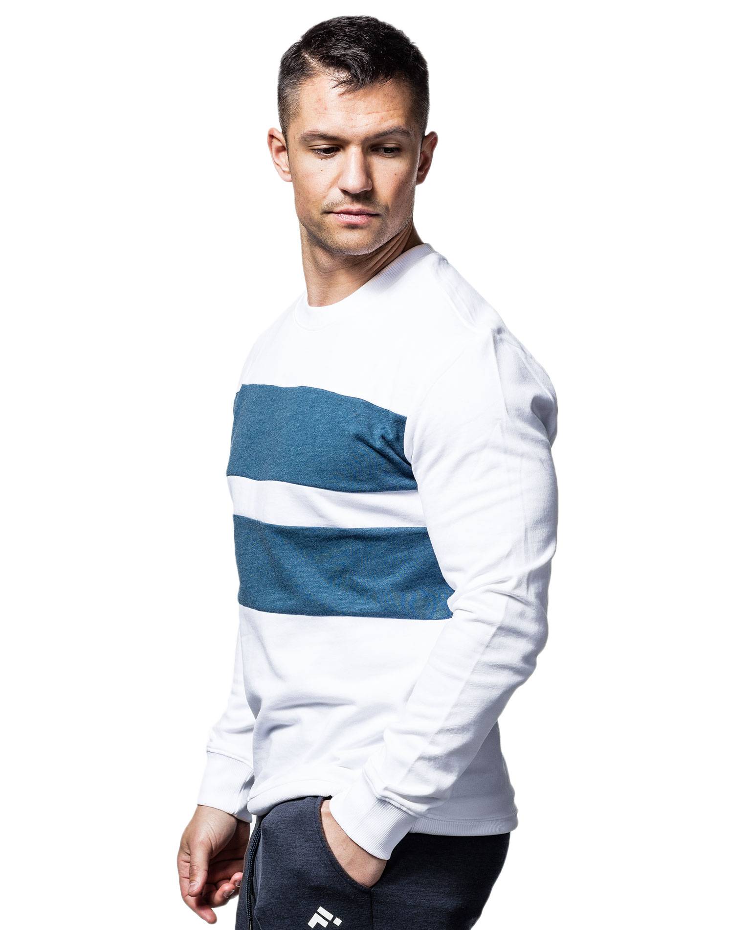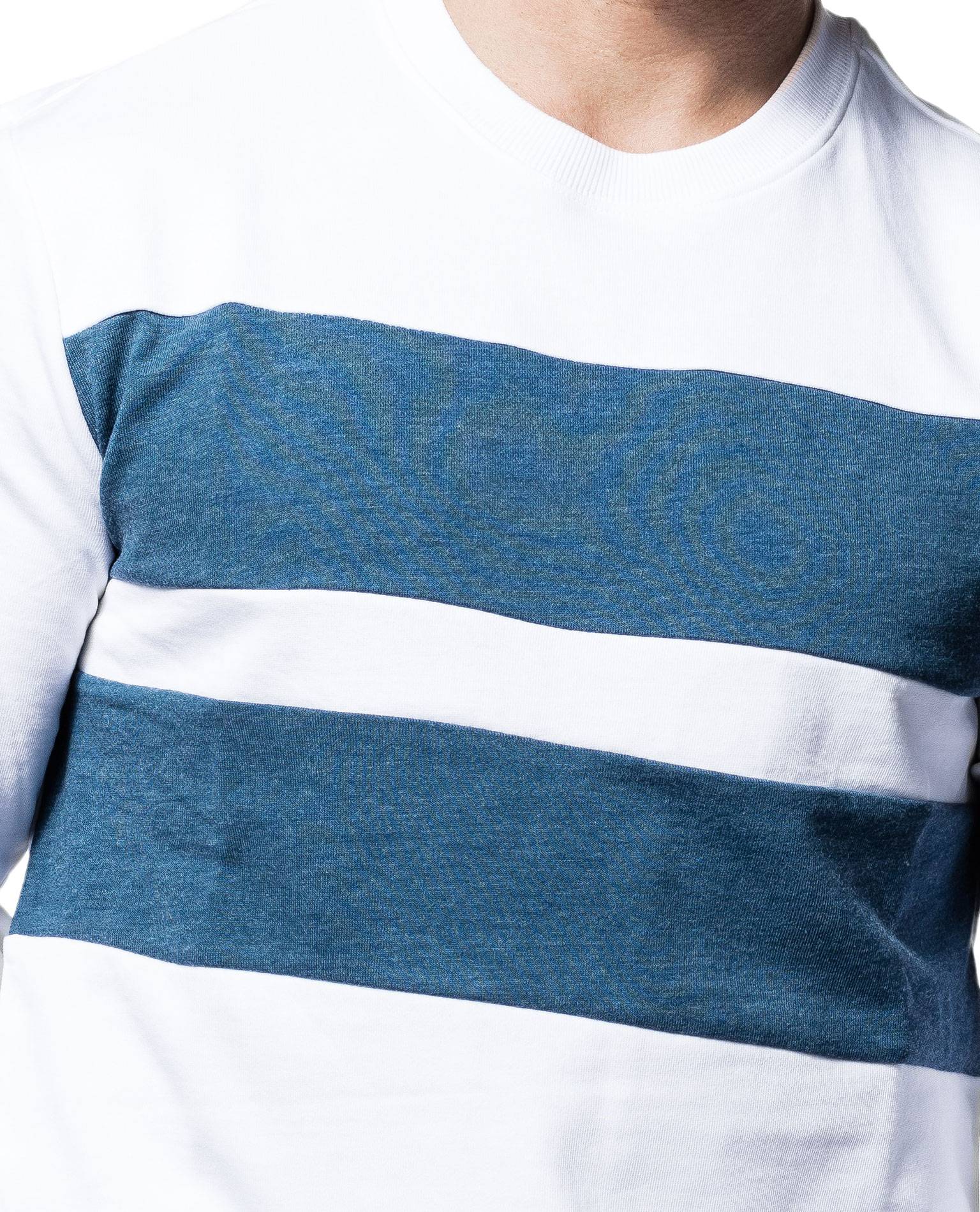 ONLY & SONS valkoinen collegepaita. Raikas raitaprinttaus sinisestä kankaasta etupuolella. Helmassa ja hihoissa resorit. Logo helmassa.