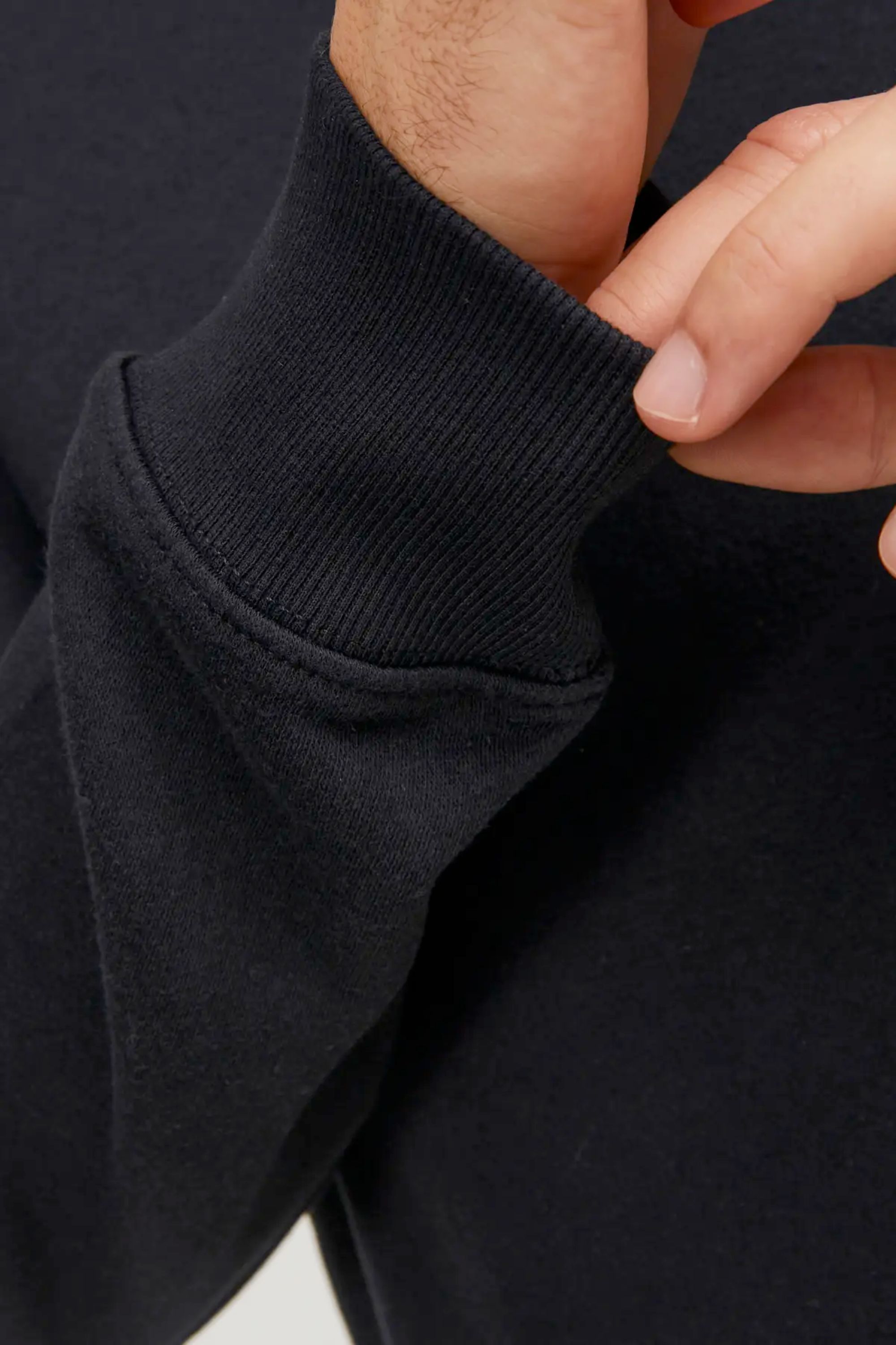 Miesten musta collegepaita. Pehmeä, harjattu sisäpinta. Käytännöllinen vaate, jota voi käyttää ympäri vuoden.