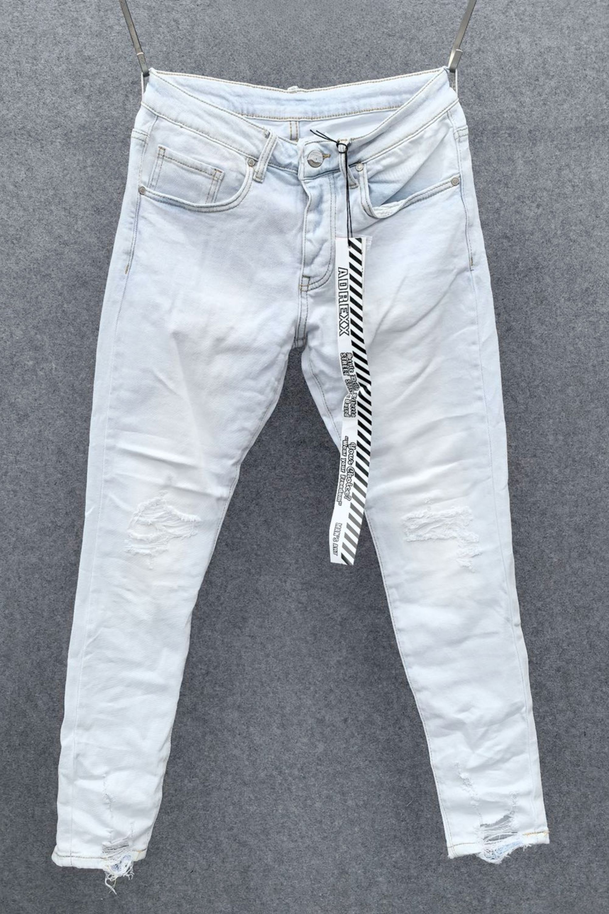 Miesten vaaleansiniet farkut, joissa nappikiinnitys sepaluksessa ja kahdet etu- ja takataskut. Erittäin joustava kangas, joka on miellyttävä päällä. Kevyesti rikottua pintaa polvissa, mutta ei mene läpi asti, sillä alla on valkoista vahvikekangasta. Punteissa rikottua pintaa. Kapeneva puntti. Pituus L32, sopii max. 185cm pitkälle.
