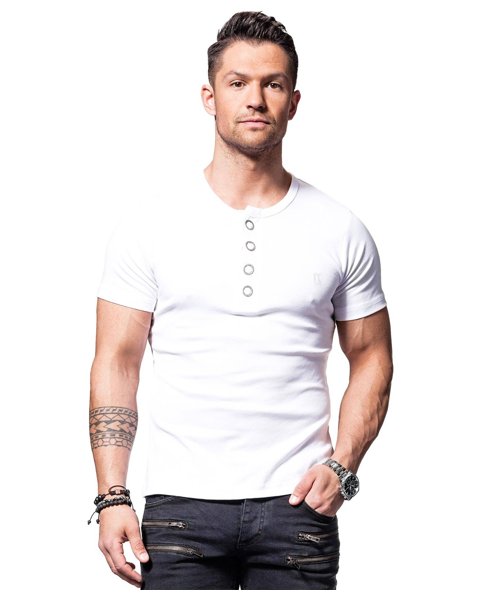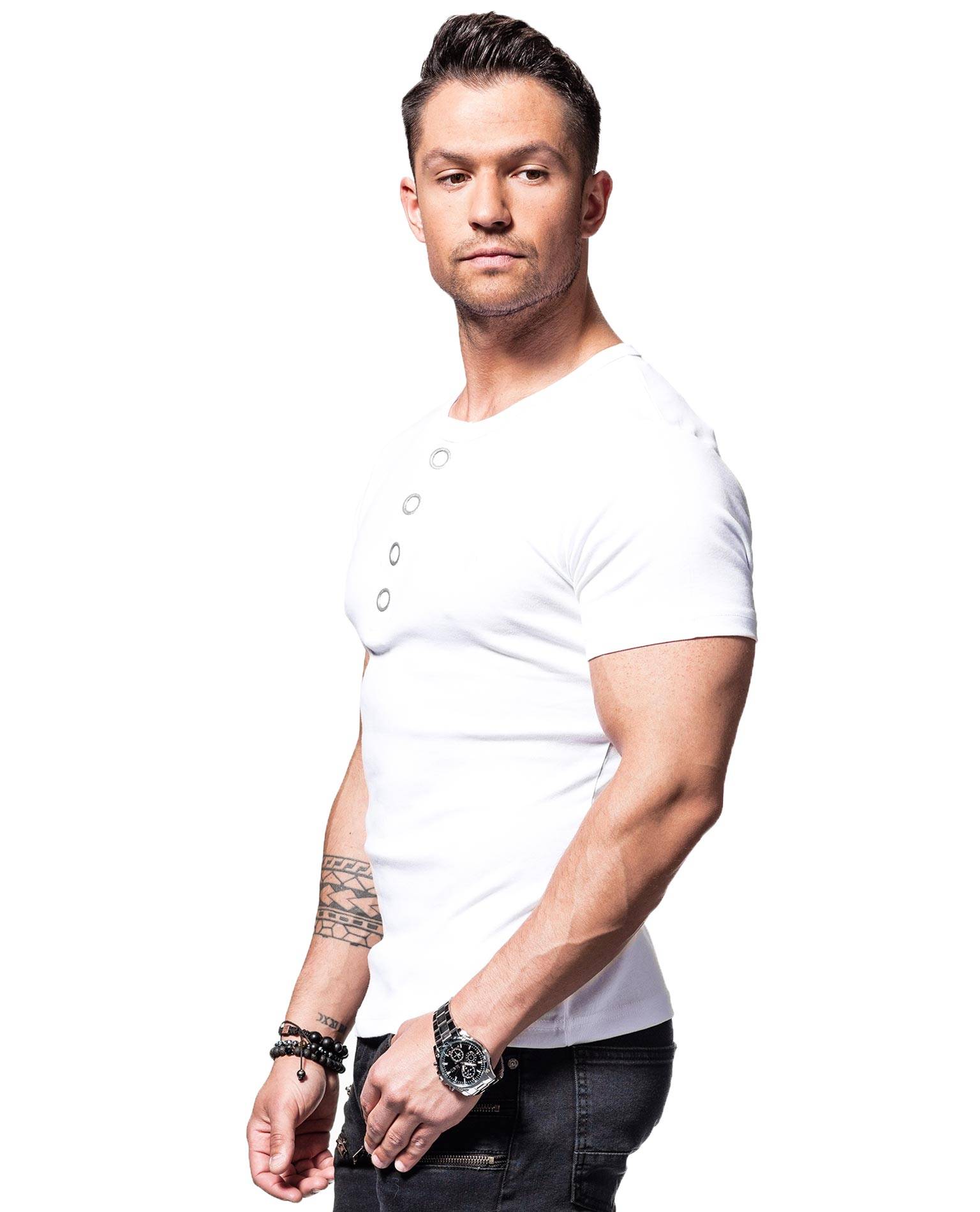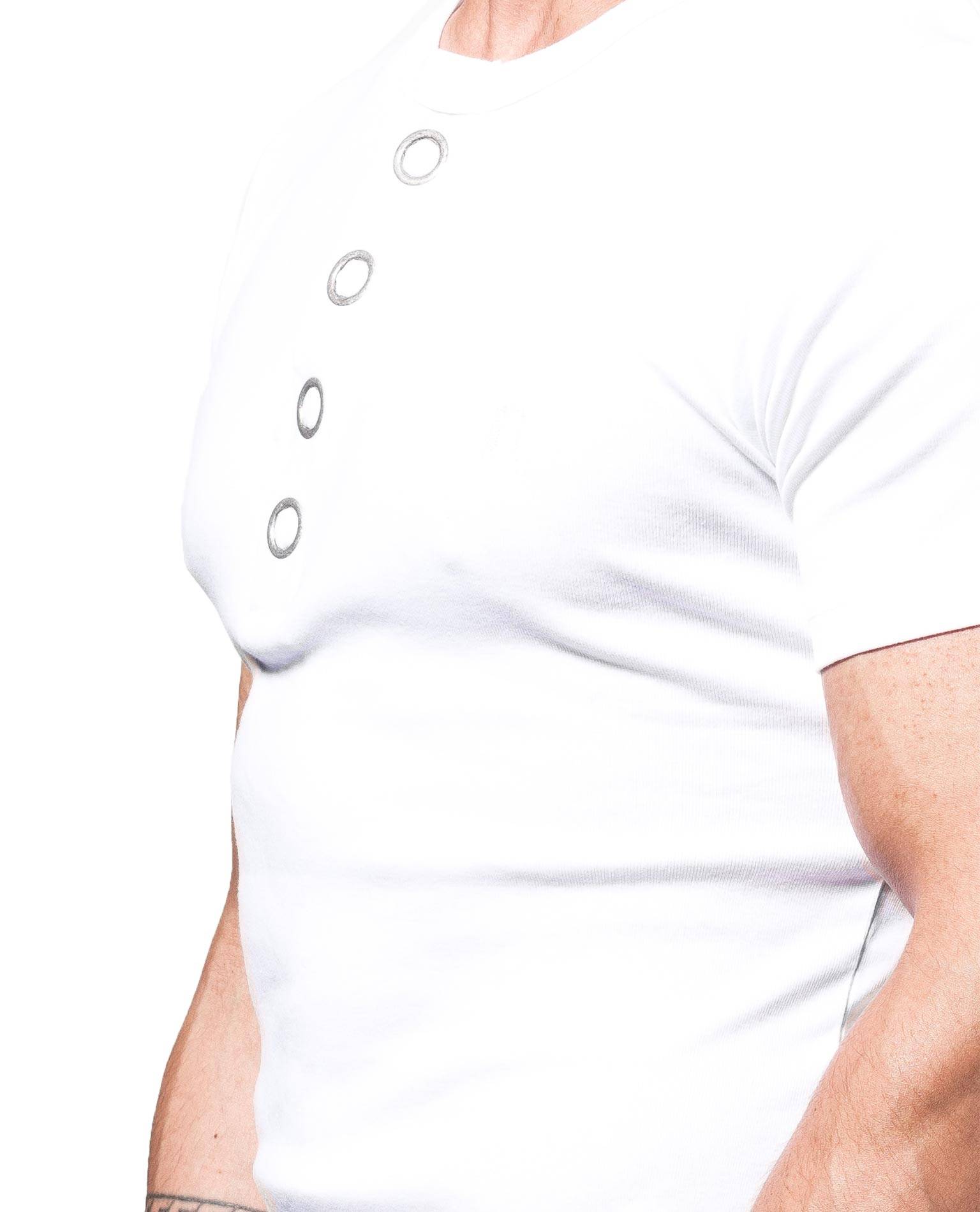 YOUNG & RICH valkoinen t-paita. Koristenapit kaula-aukossa.
