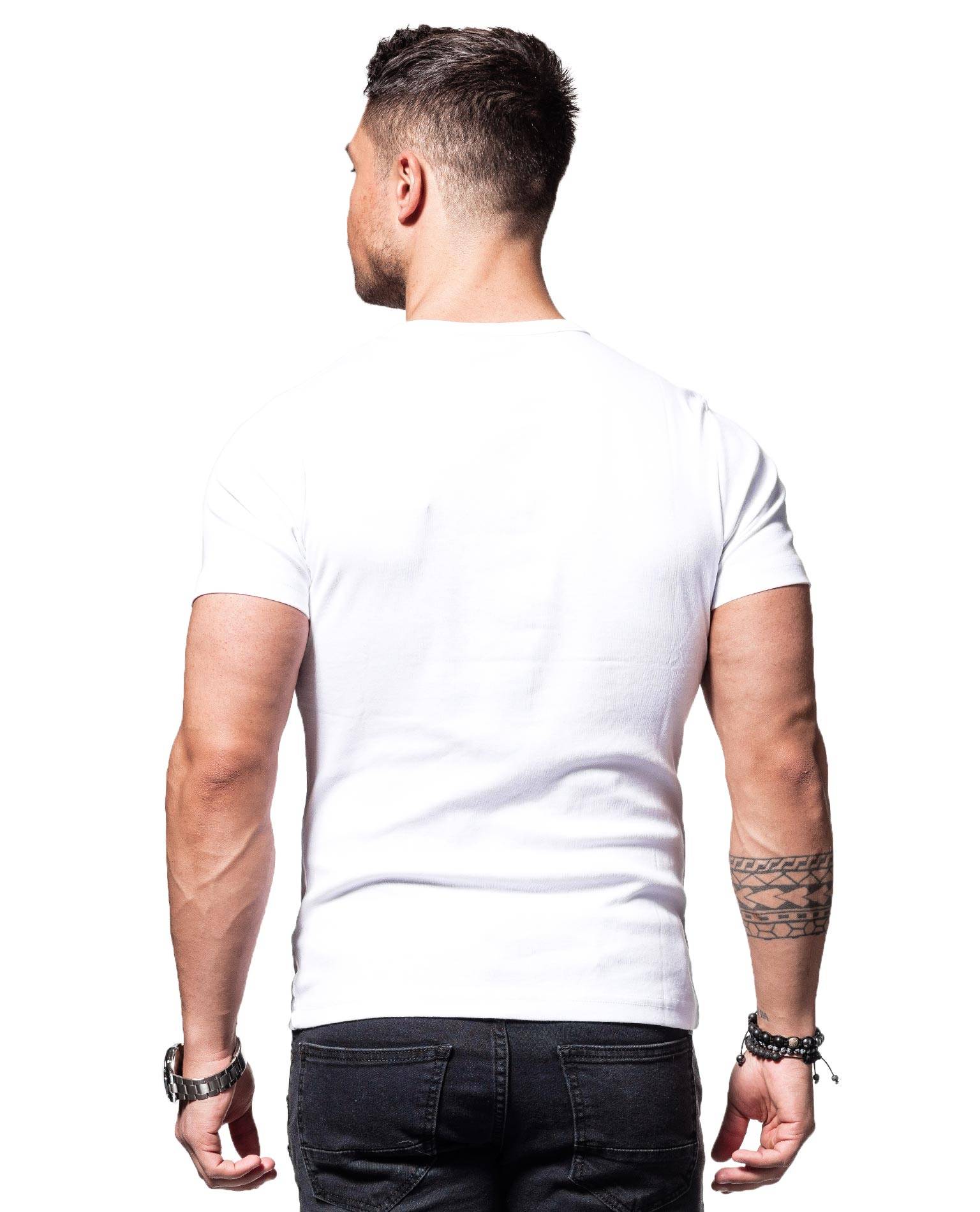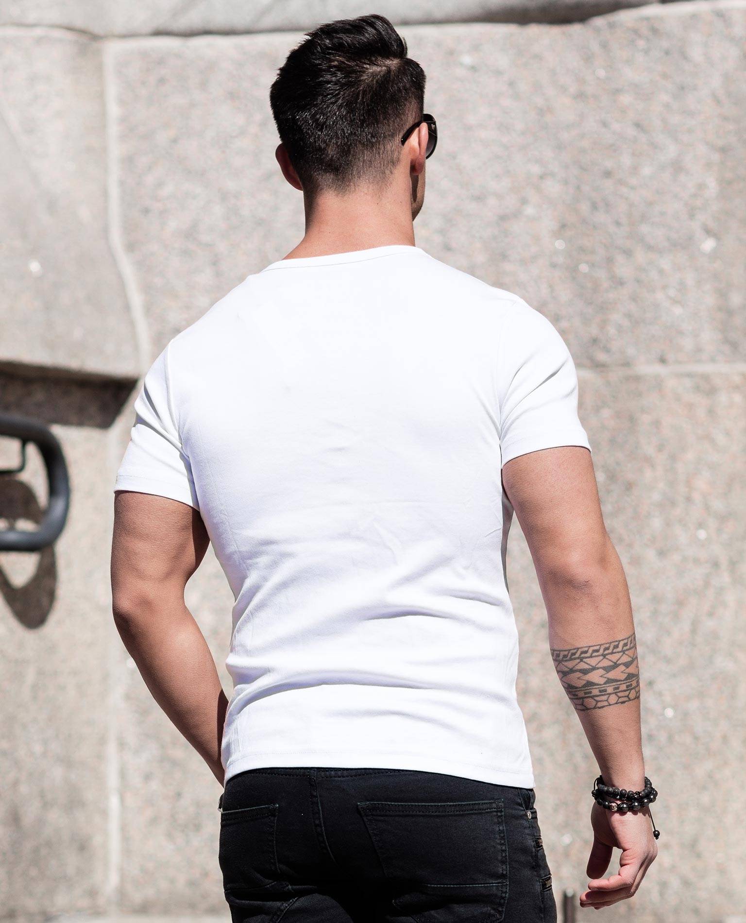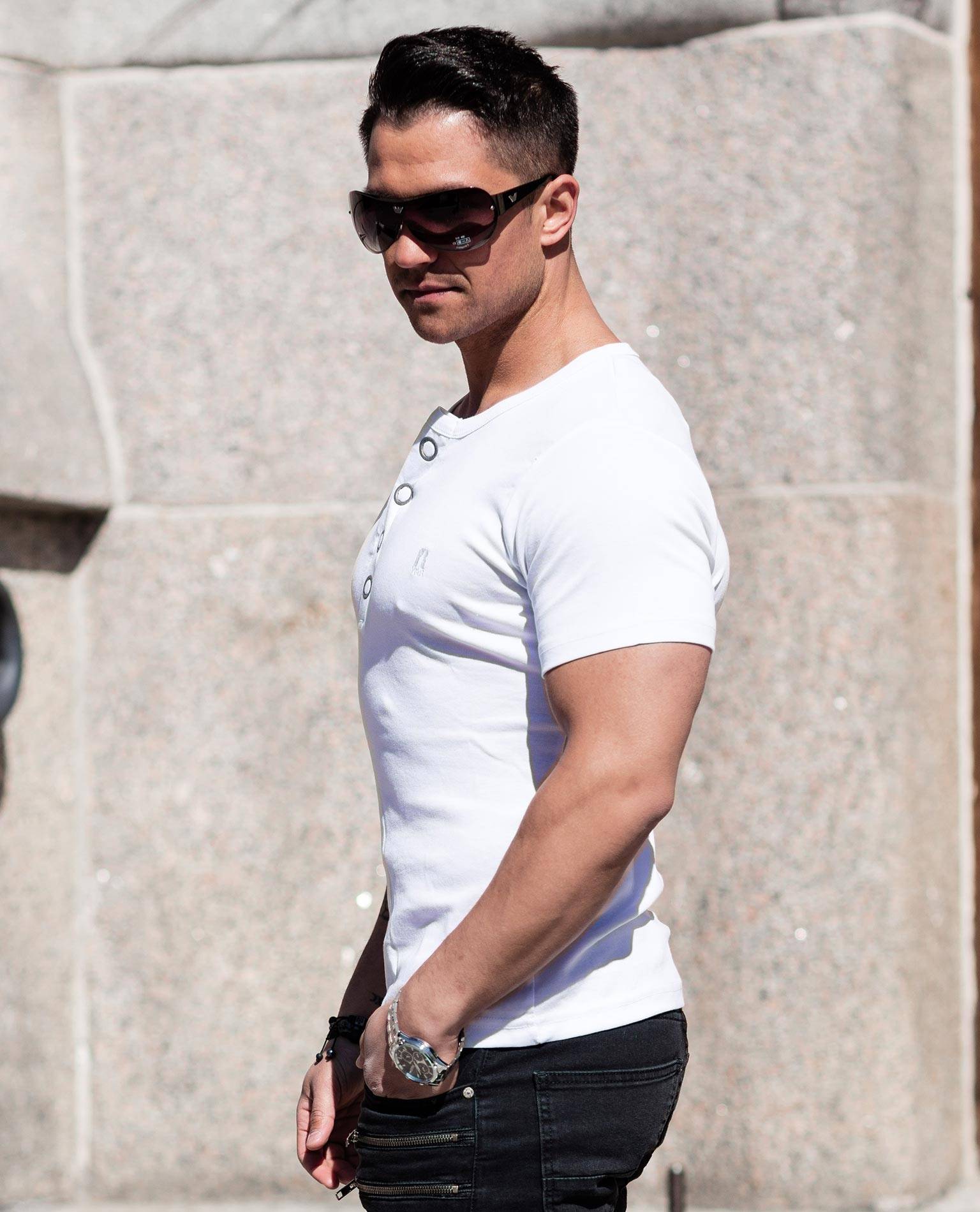 YOUNG & RICH valkoinen t-paita. Koristenapit kaula-aukossa.