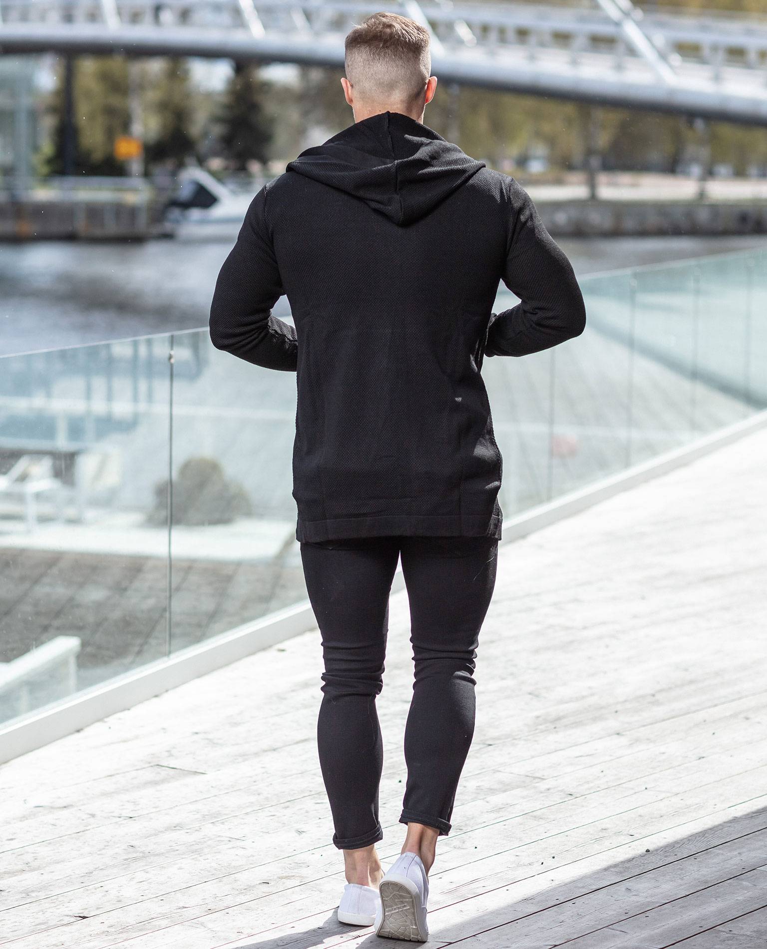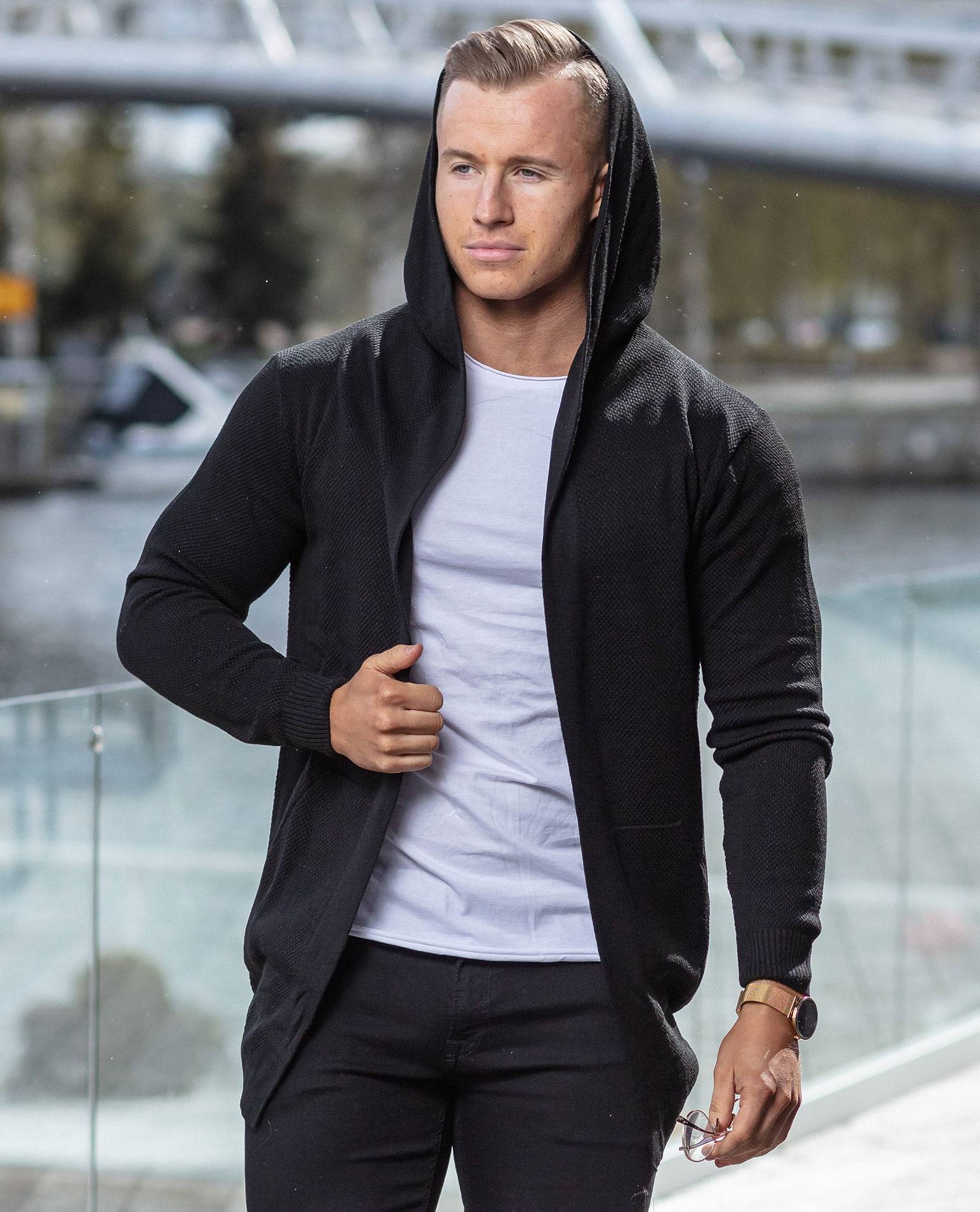 CARISMA musta neuletakki. Kevyt ja ohuehko kangas, ja avoin malli edestä. Strukturoitu pinta, huppu. Trendikäs ja ajaton vaate.